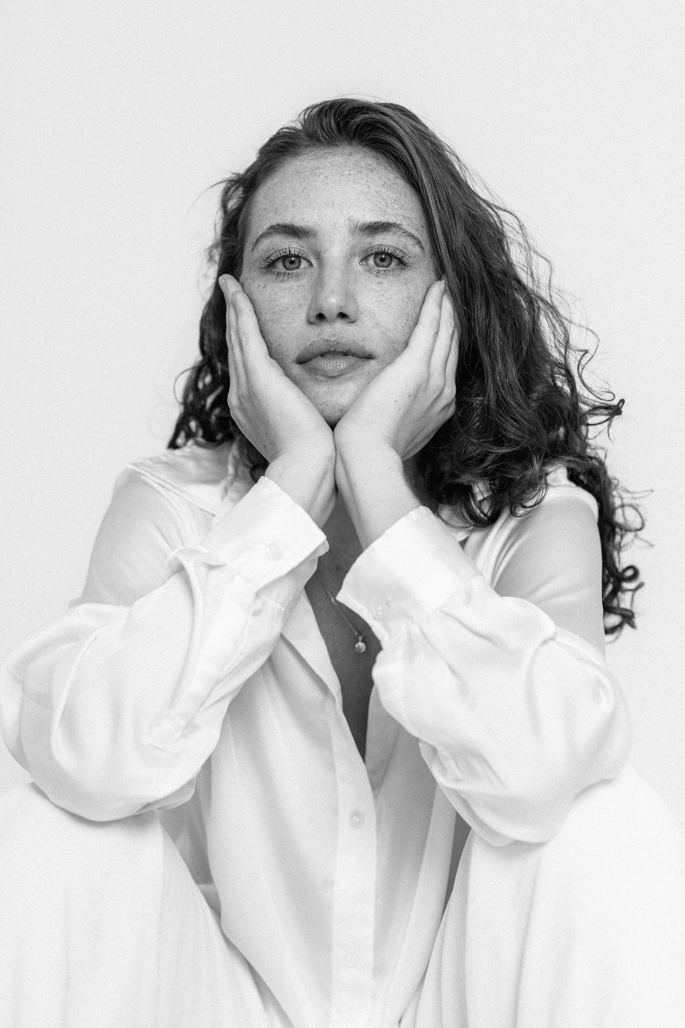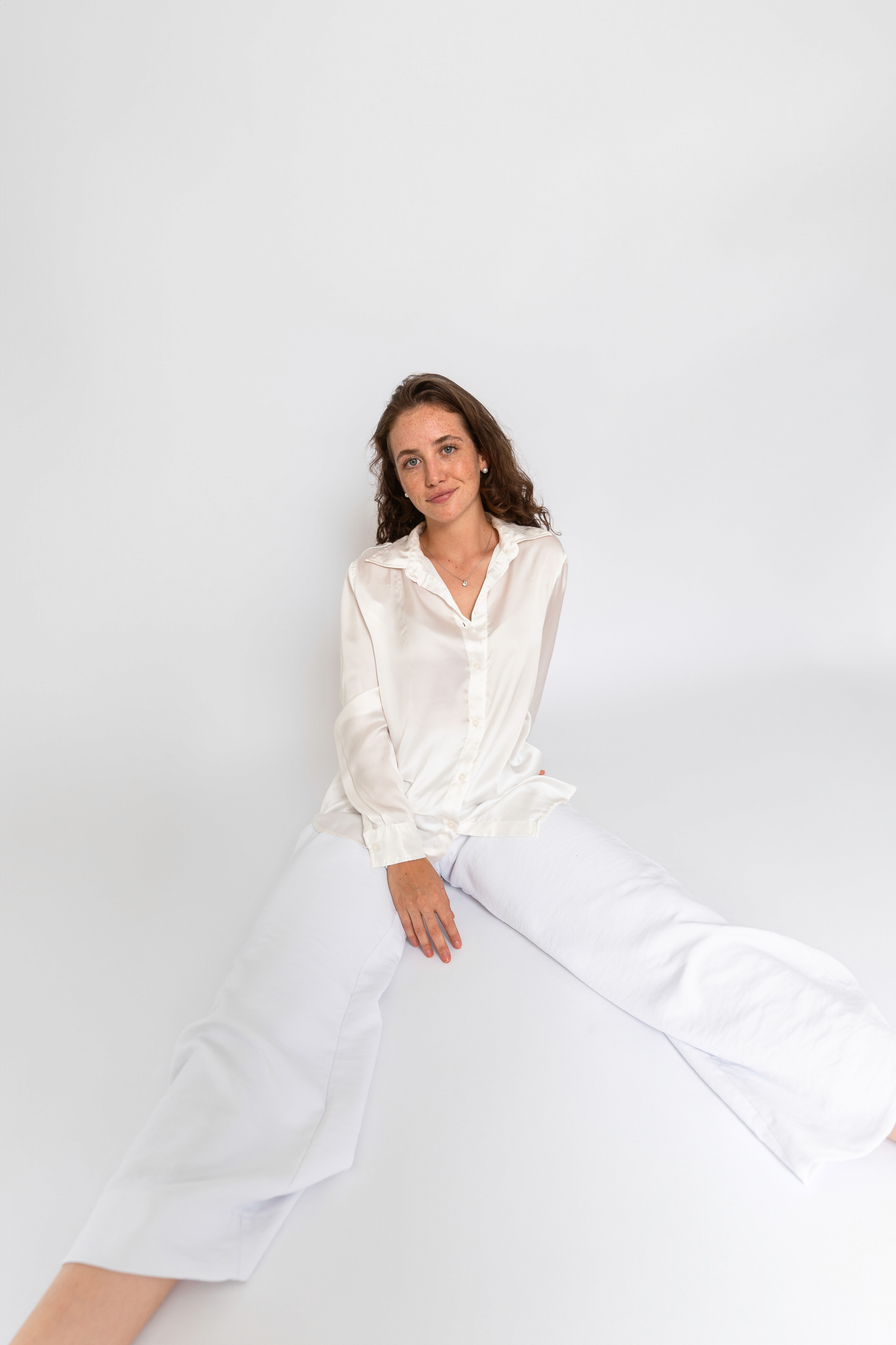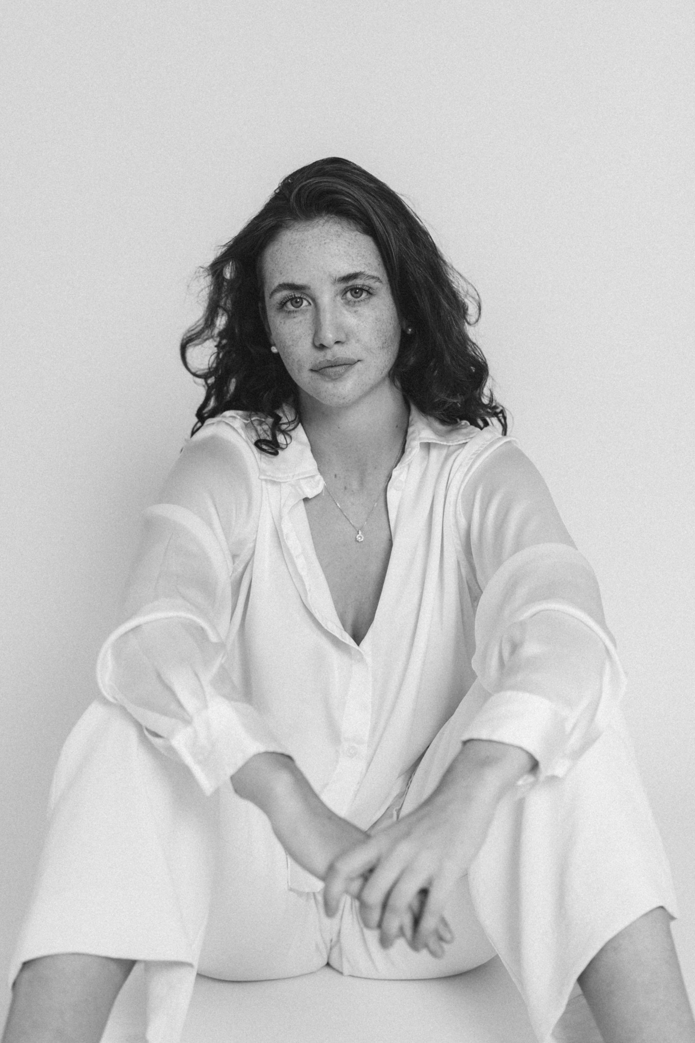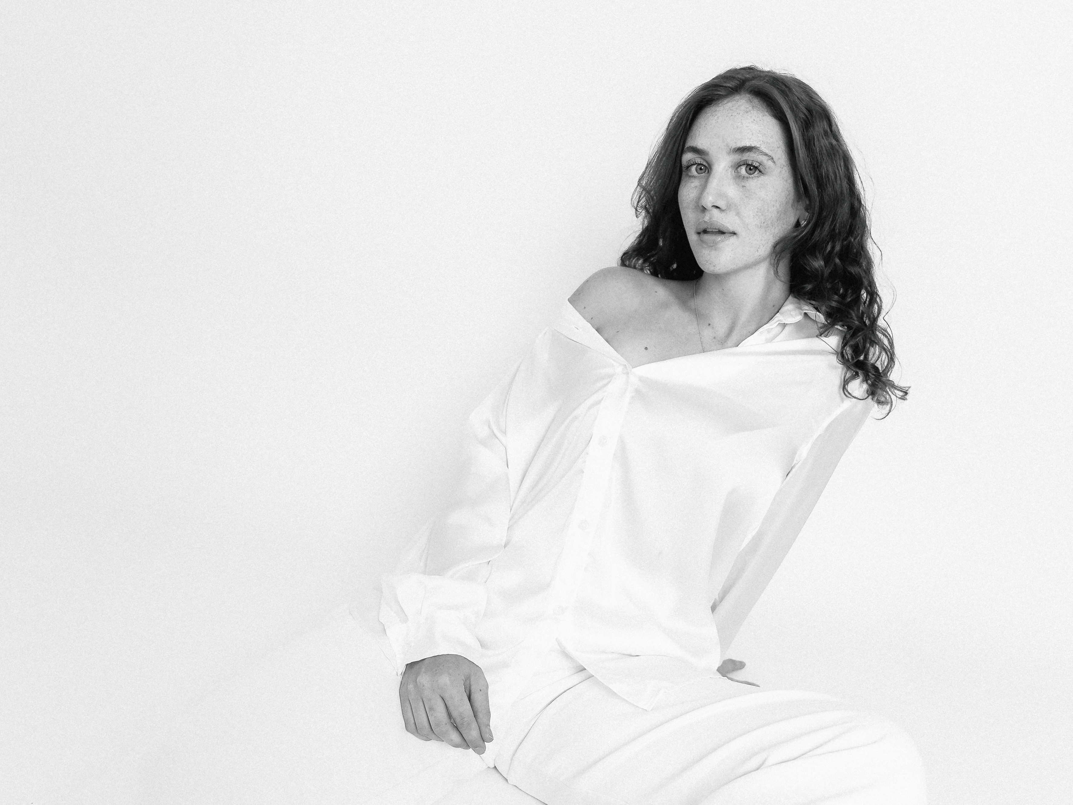 Das Shooting fand in einer privaten Wohnung statt, in der wir mit einem weißen Papierhintergrund und Blitzlicht ein einfaches Studio-Setup aufgebaut haben. Der Fokus lag auf neutralen, sauberen Bildern, in denen Ausdruck und Haltung im Mittelpunkt stehen.